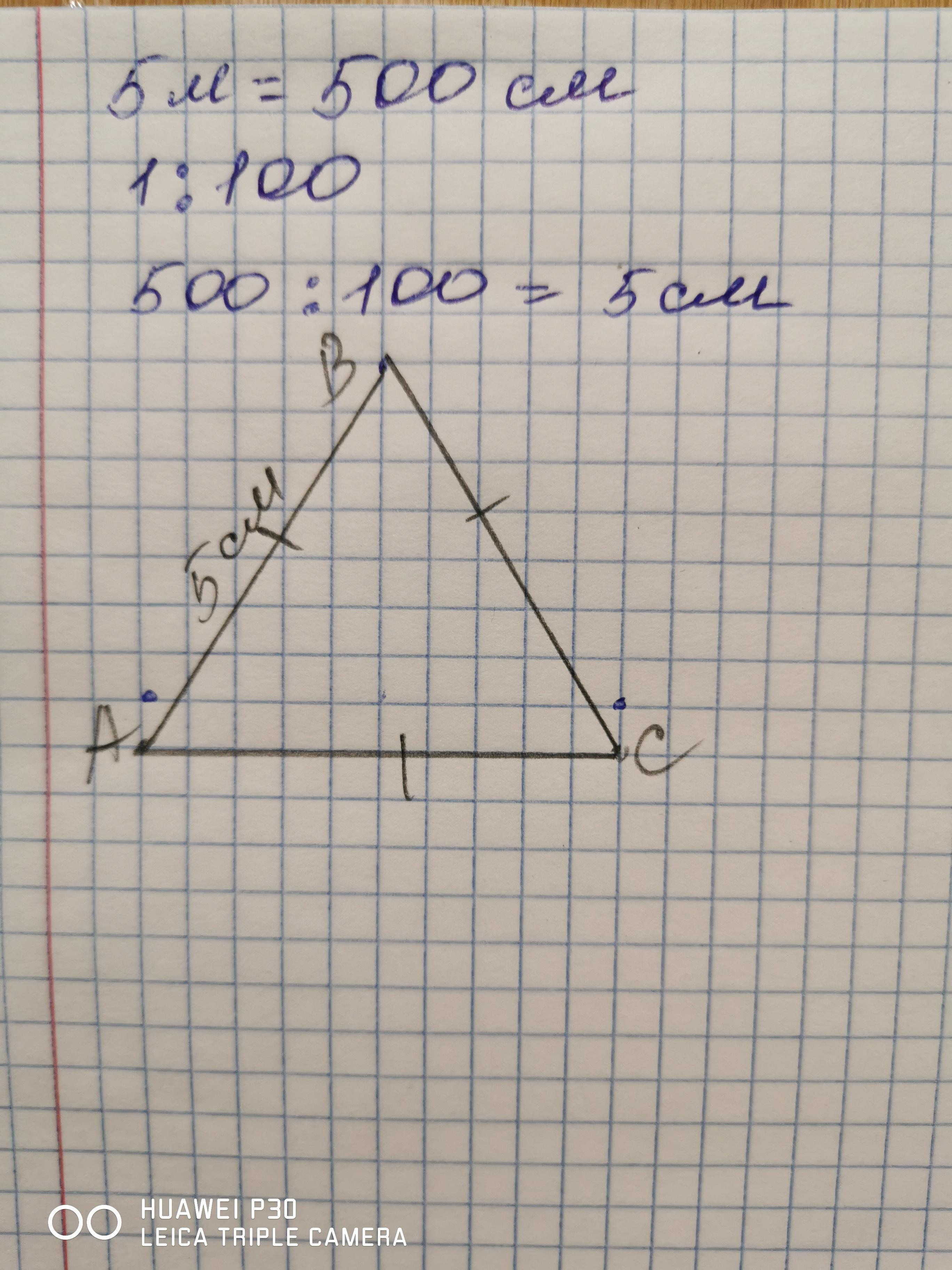 Зроби креслення басейну, що має форму рівностороннього трикутника зі стороною 5м, у масштабі 1:100