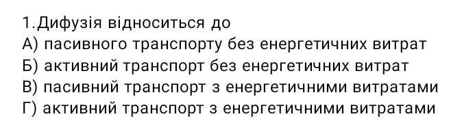 1. Дифузія відноситься до А) пасивного транспорту без енергетичних витрат Б) активний транспорт без енергетичних витрат В) пасивний транспорт з енергетичними витратами Г) активний транспорт з енергетичними витратами