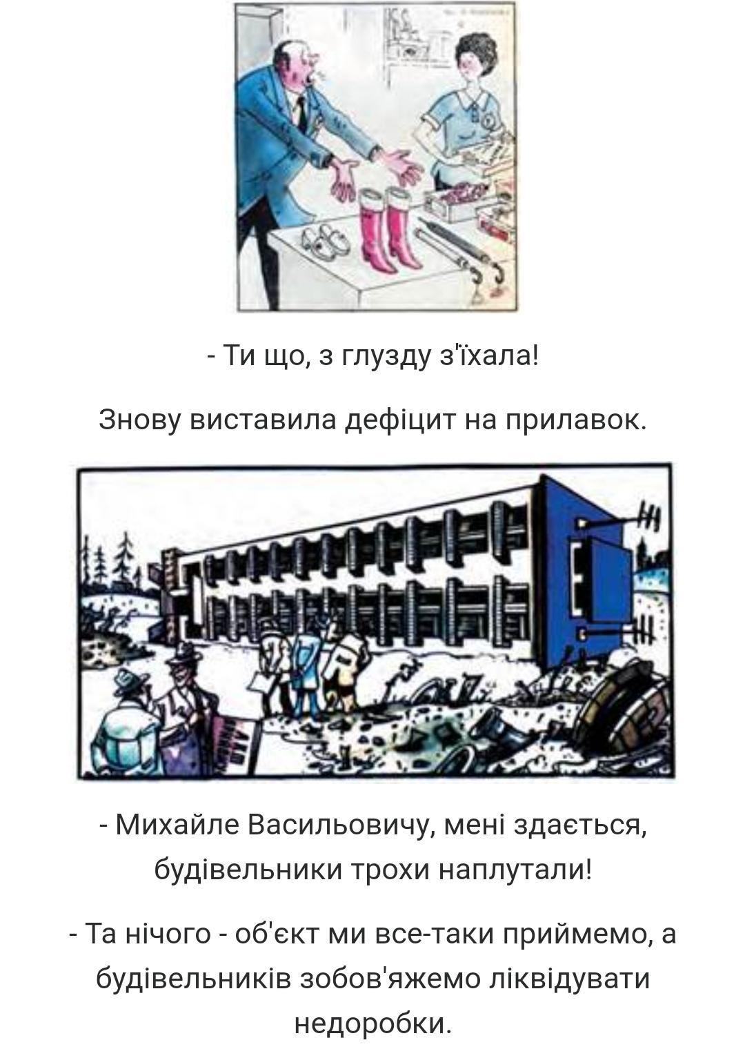 1. Ці карикатури присвоєнні повсякденним явищам совєсткіх людей, таких, як дефіцит та числені архітектурні помилки проекторів домів