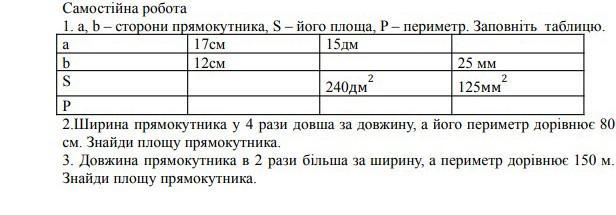1. a, b- сторони прямокутника, S - його площа, Р-периметр. Заповніть таблицю. a 17cm 15дм 12см b S P 25 мм 125мм 2 240дм² 2.Ширина прямокутника у 4 рази довша за довжину, а його периметр дорівнює 80 см. Знайди площу прямокутника. 3. Довжина прямокутника в 2 рази більша за ширину, а периметр дорівнює 150 м. Знайди площу прямокутника.