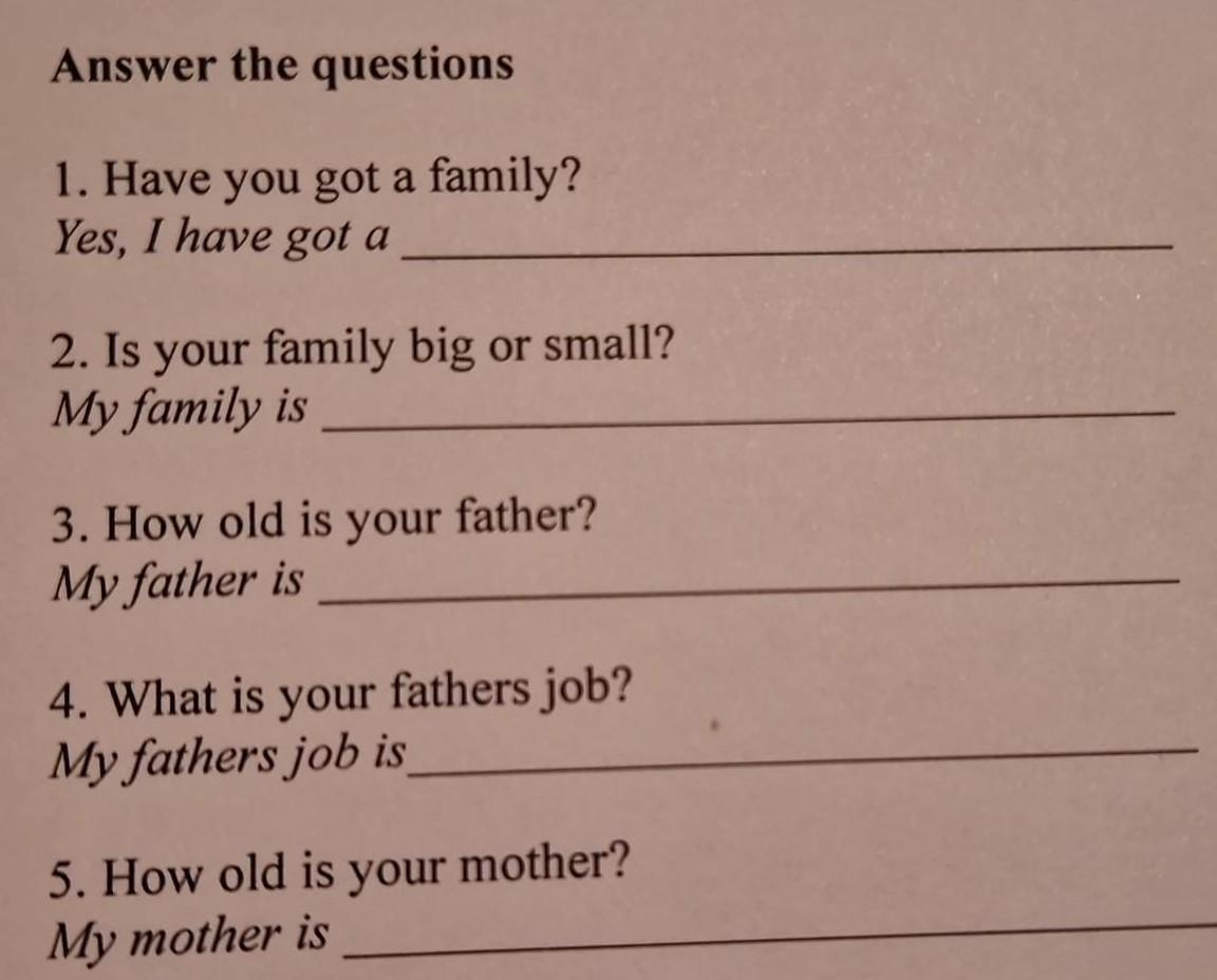 Answer the questions 1. Have you got a family? Yes, I have got a 2. Is your family big or small? My family is 3. How old is your father? My father is 4. What is your fathers job? My fathers job is 5. How old is your mother? My mother is