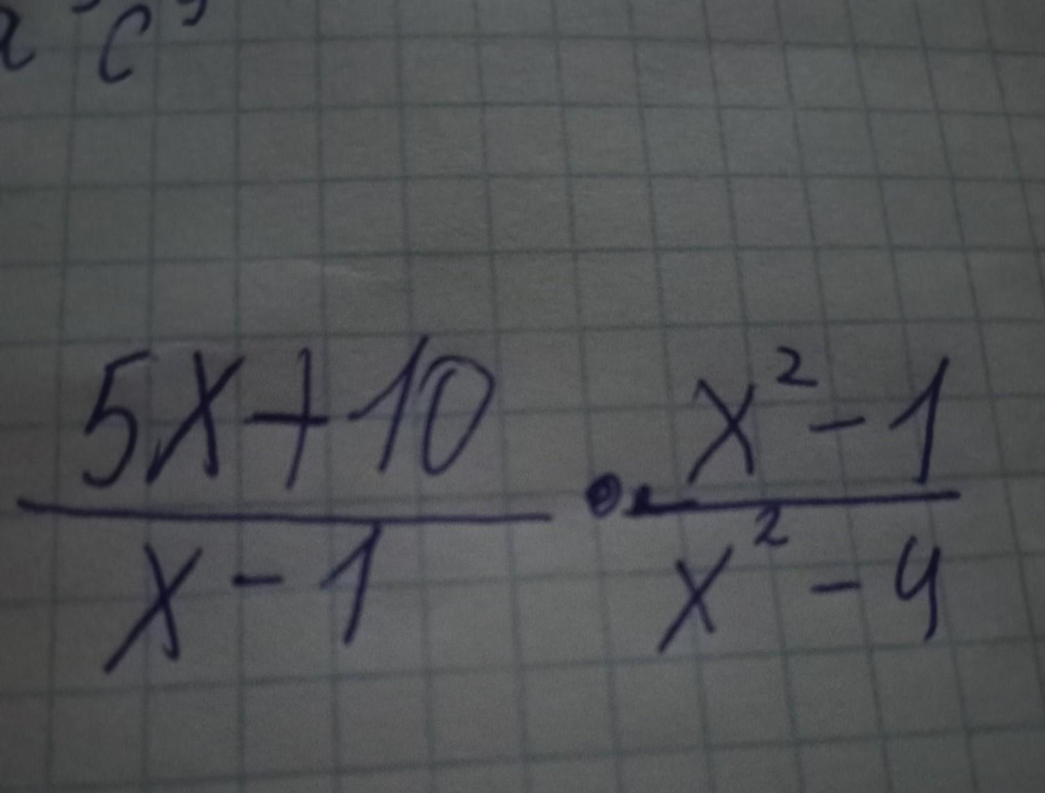\displaystyle\bf\\\frac{5x+10}{x-1} \cdot\frac{x^{2} -1}{x^{2} -4} =\frac{5\cdot(x+2)\cdot(x-1)\cdot(x+1)}{(x-1)\cdot(x+2)\cdot(x-2)} =\\\\\\=\frac{5\cdot(x+1)}{x-2} =\frac{5x+5}{x-2}