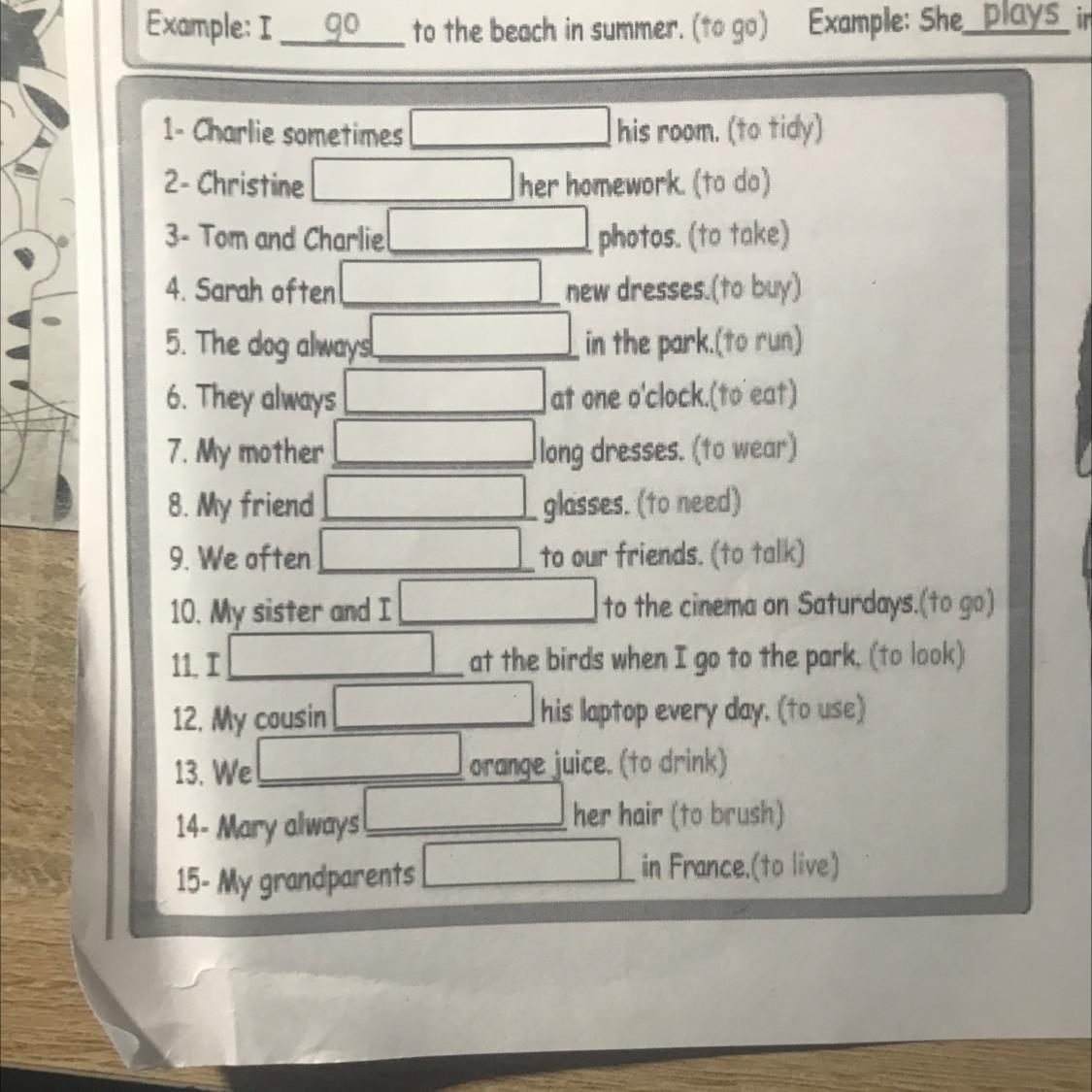 4. Sarah often buys new dresses. 5. The dog always runs in the park.