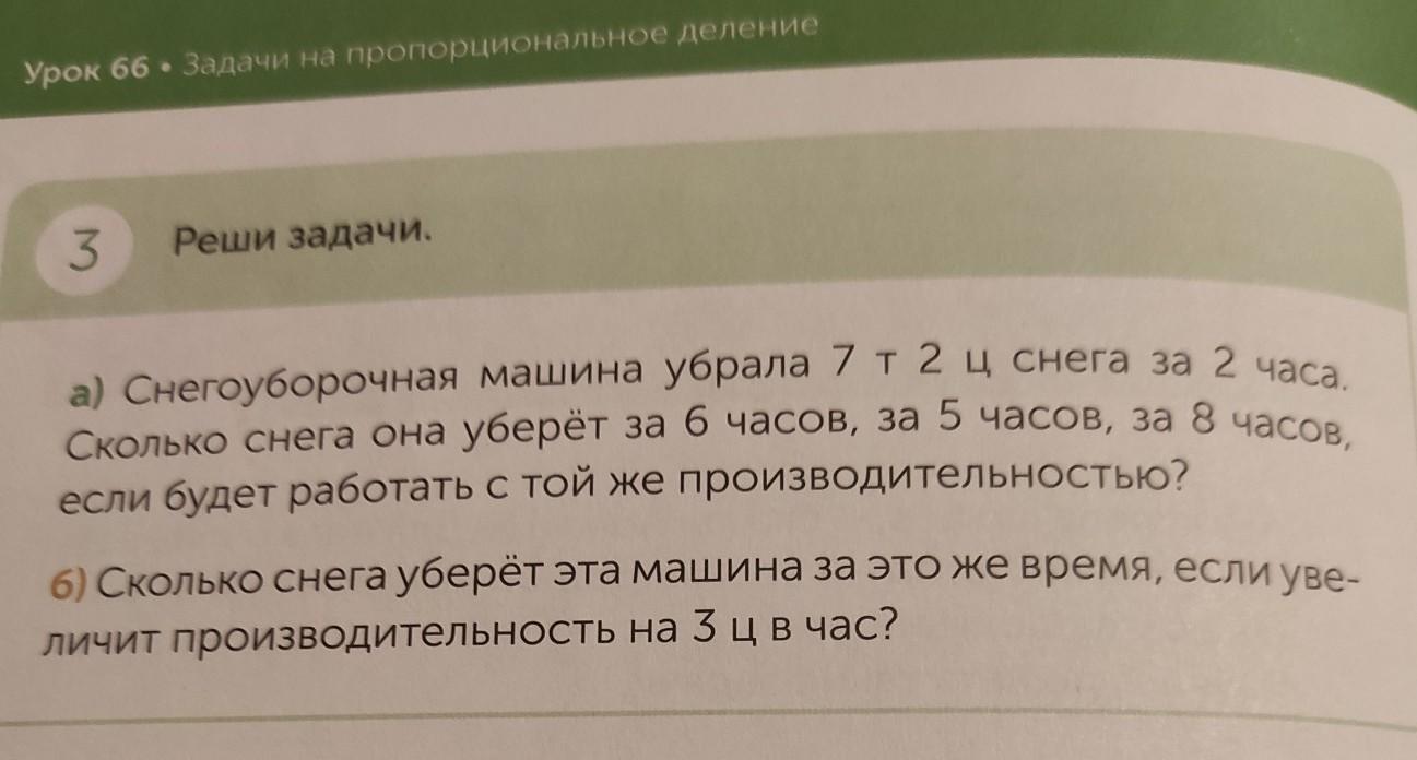 3 Реши задачи. а) Снегоуборочная машина убрала 7 т 2 ц снега за 2 часа. Сколько снега она уберёт за 6 часов, за 5 часов, за 8 часов, если будет работать с той же производительностью? б) Сколько снега уберёт эта машина за это же время, если увеличит производительность на 3 ц в час?