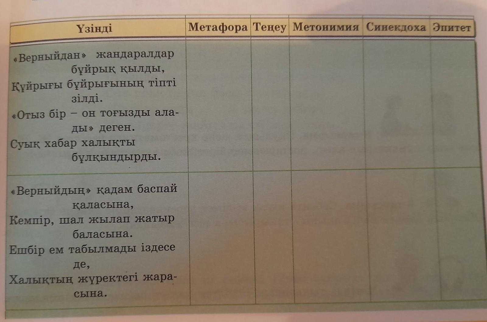 ала 1 а: 7-тапсырма. Керіктеу құралдарын тауып, кестені толтырыңдар. Узiндi •Верныйдан» жандаралдар буйрык кылды, Куйрыгы буйрыгынын тіпті зiлдi. «Отыз бiр - он тогызды ала- ды» деген. Суык хабар халықты булкындырды. • Верныйдын» кадам баспай каласына, Кемпір, шал жылап жатыр баласына. Ешбiр ем табылмады іздесе де, Халыктын журектегi жара- сына. Метафора Теңеу Метонимия Синекдоха Эпитет