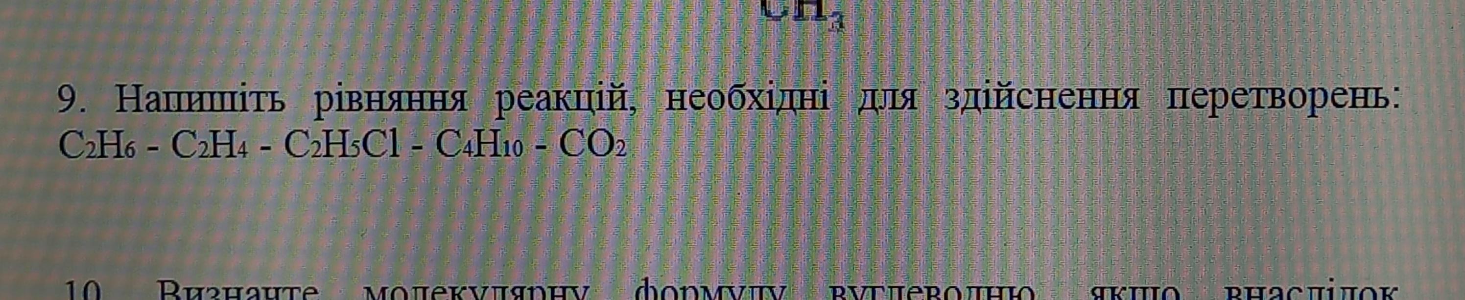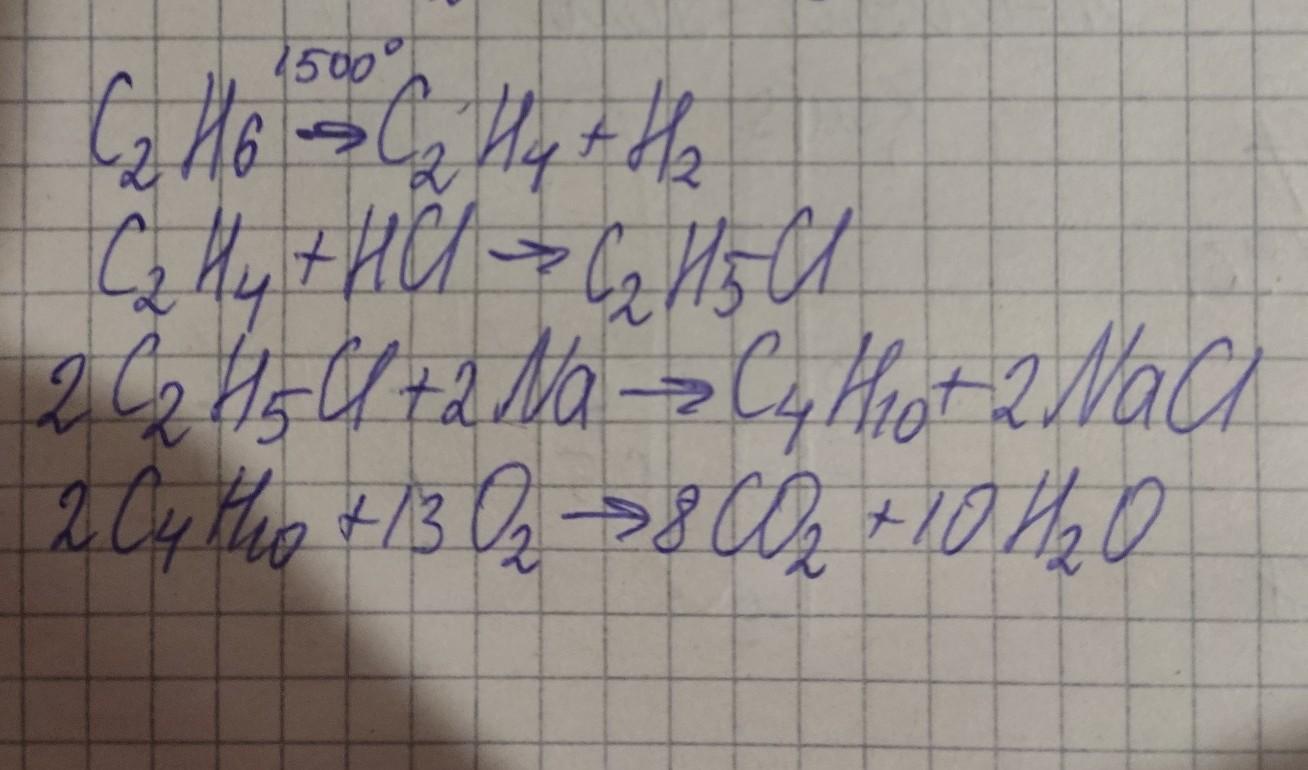 Напишіть рівняння реакцій , необхідні для здійснення перетворень : C2H6-C2H4-C2H5Cl-C4H10-CO2