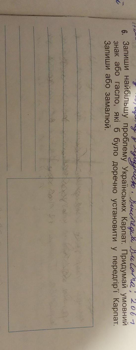 6. Запиши найбільшу проблему Украïнських Карпат. Придумай умовний знак або гасло, які б було доречно установити у передгір'ї Карпат, Запиши або замалюй.