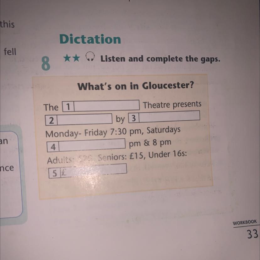 Ответ:The season Theatre presents 2)In by 3) vistrise Monday-Friday 7:30 pm,Saturdays 4)Time pm & 8 pm Adults:€20,Seniors:€15,Under 16s