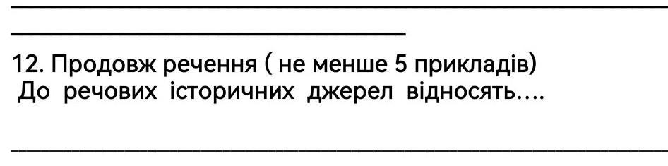 12. Продовж речення ( не менше 5 прикладів) До речових історичних джерел відносять…. _______