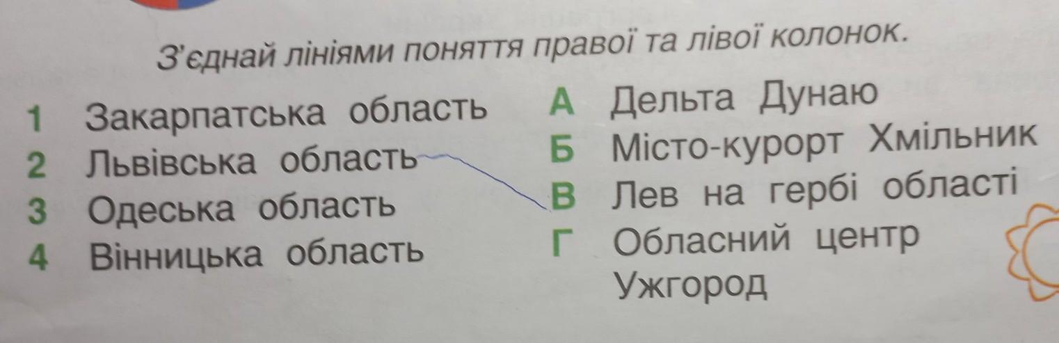 З'єднай лiнiями поняття правої та лівої колонок. 1 Закарпатська область А Дельта Дунаю 2 Львівська область Місто-курорт Хмільник 3 Одеська область в Лев на гербі області Г Обласний центр 4 Вінницька область Б Ужгород