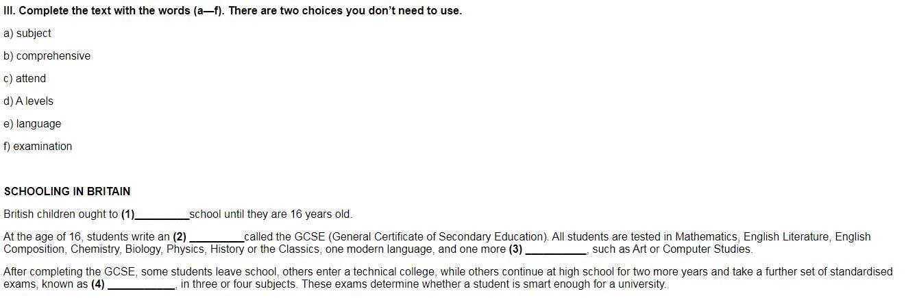 Complete the text with the words (a-f). There are two choices you don't need to use. e) language c) attend d) A levels f) examination SCHOOLING IN BRITAIN a) subject b) comprehensive (1) school until they are British children ought to 16 years old. At the age of 16, students write an (2) called the GCSE (General Certificate of Secondary Education). All students are tested in Math- ematics, English Literature, English Composition, Chemistry, Biology, Physics, History or the Classics, one modern language, and one more such as Art or Computer Studies. After completing the GCSE, some students leave school, others enter a techni- cal college, while others continue at high school for two more years and take a fur- ther set of standardised exams, known as (4), in three or four sub- jects. These exams determine whether a student is smart enough for a university.