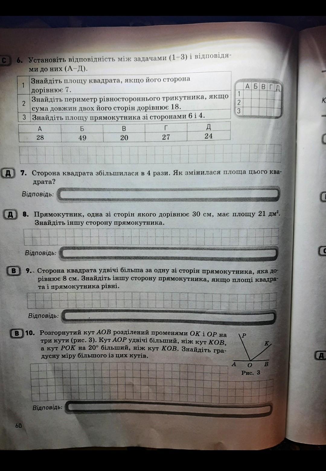С 6. Установіть відповідність між задачами (1-3) і відповідя- ми до них (А-Д). Знайдіть площу квадрата, якщо його сторона дорівнює 7. 2 Знайдіть периметр рівностороннього трикутника, якщо сума довжин двох його сторін дорівнює 18. 3 Знайдіть площу прямокутника зі сторонами 6 і 4. Г 27 1 A 28 60 Відповідь: Б 49 B 20 Відповідь: Д 24 Д 7. Сторона квадрата збільшилася в 4 рази. Як змінилася площа цього ква- драта? Відповідь: Д 8. Прямокутник, одна зі сторін якого дорівнює 30 см, має площу 21 дм². Знайдіть іншу сторону прямокутника. Відповідь: В 10. Розгорнутий кут АОВ розділений променями ОК і OP на три кути (рис. 3). Кут АОР удвічі більший, ніж кут КОВ, а кут РОК на 20° більший, ніж кут КОВ. Знайдіть гра- дусну міру більшого із цих кутів. 1 23 В 9. Сторона квадрата удвічі більша за одну зі сторін прямокутника, яка до- рівнює 8 см. Знайдіть іншу сторону прямокутника, якщо площі квадра- та і прямокутника рівні. А Б В Г Д A \P 0 Рис. 3 K В K C С Д