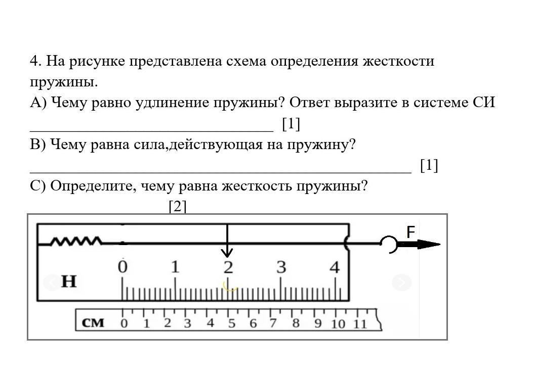 4. На рисунке представлена схема определения жесткости пружины. А) Чему равно удлинение пружины? Ответ выразите в системе СИ ______________________________ [1] В) Чему равна сила,действующая на пружину? _______________________________________________ [1] С) Определите, чему равна жесткость пружины? [2]