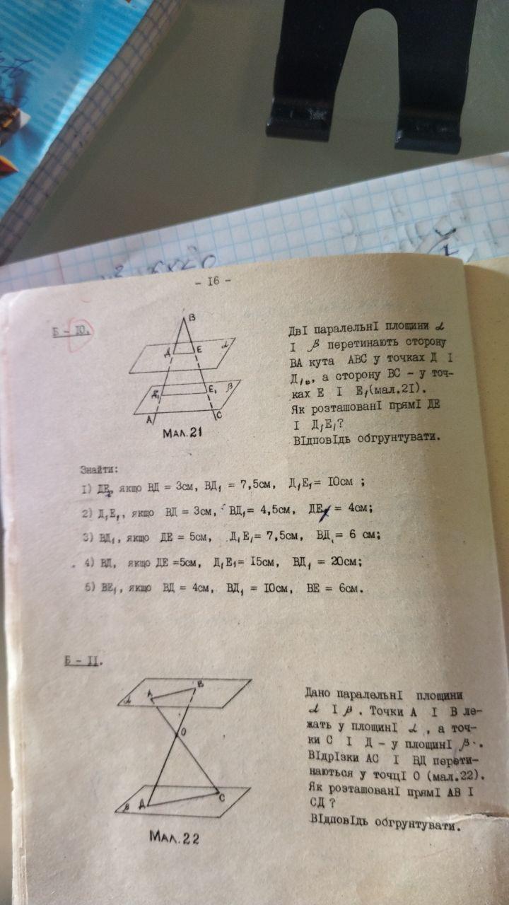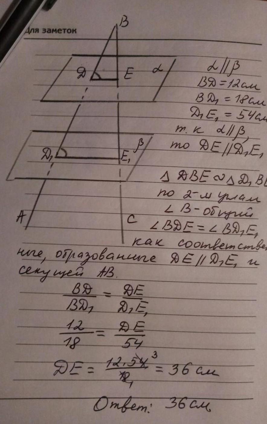 Дві паралельні площини альфа і бета перетинають сторону БА кута АБС в точках Д і Д1, а сторону БС в точках Е і Е1. Знайти довжину відрізка ДЕ І ДЕ1,. ВЕ, якщо