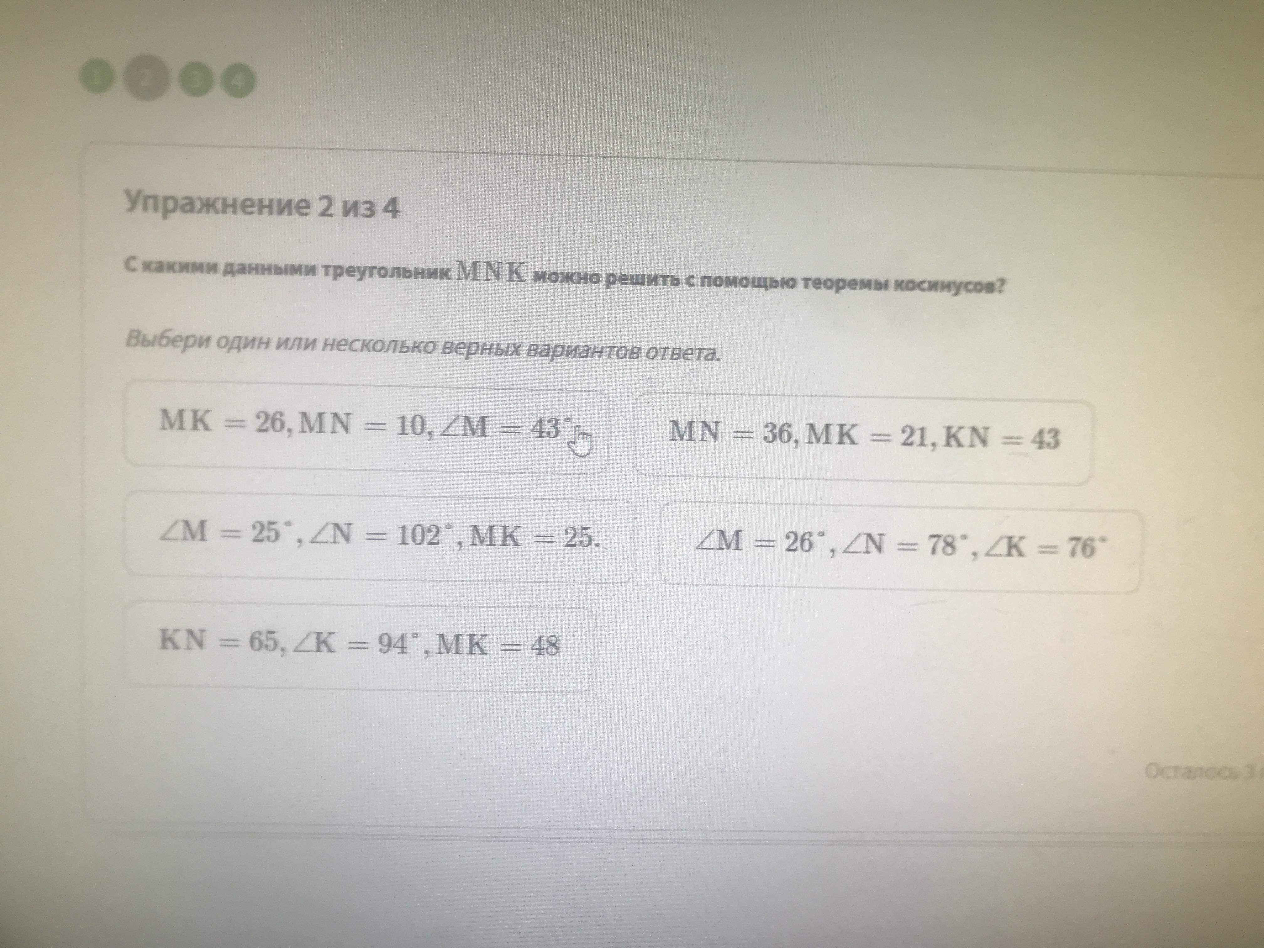С какими данными треугольник MNK можно решить с помощью теоремы косинусов?