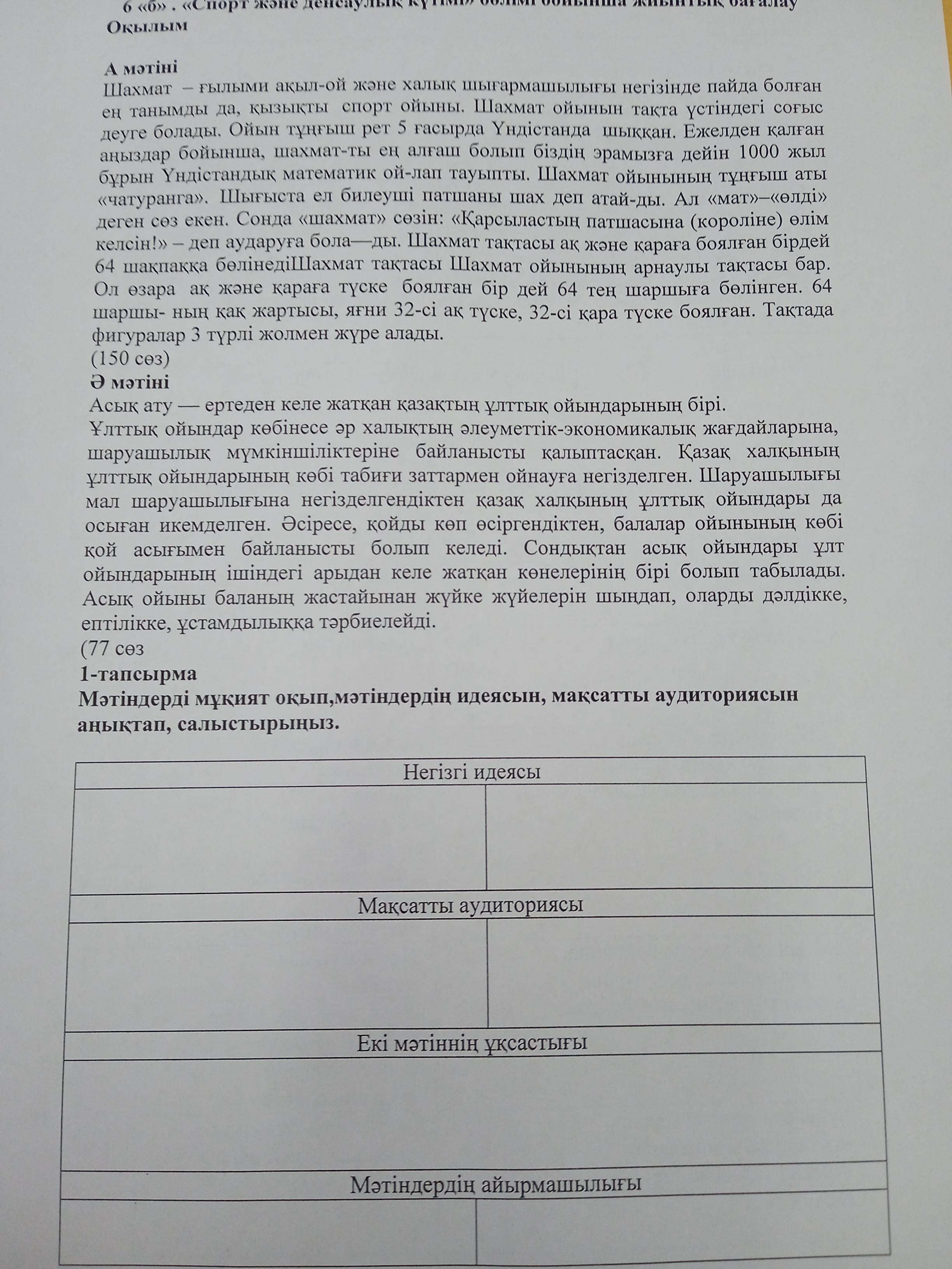 Негізгі идеясы:А мәтіні-шахмат ойыны туралы.