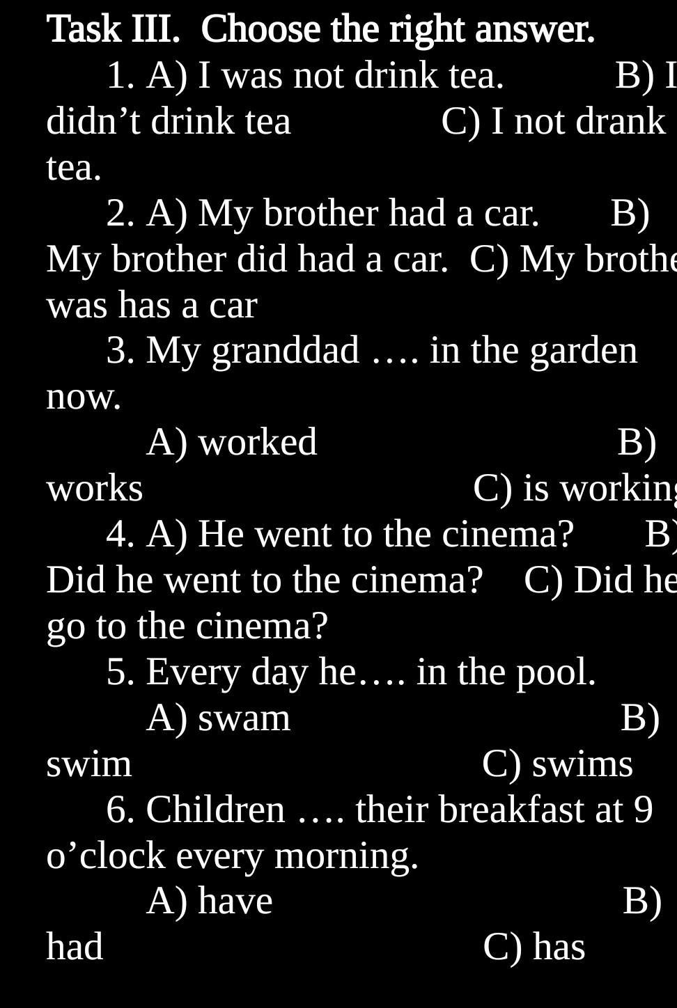 Ответ: 1. I didn`t drink tea. 2.My brother had a car. 3.