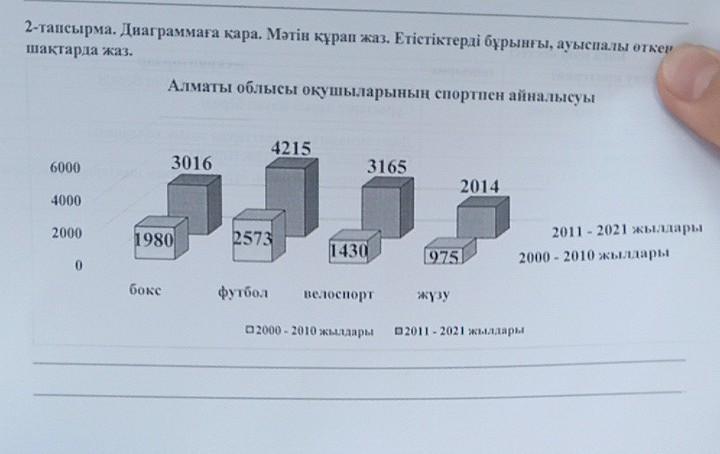 2-тапсырма. Диаграммага қара. Мәтін құрап жаз. Етістіктерді бұрынғы, ауыспалы өткен шактарда жаз. Алматы облысы оқушыларының спортпен айналысуы 6000 4000 2000 0 3016 1980 бокс 4215 2573 футбол 3165 1430 велоспорт D2000-2010 жылдары 2014 975 2011 - 2021 жылдары 2000 - 2010 жылдары жүзу D 2011-2021 жылдары