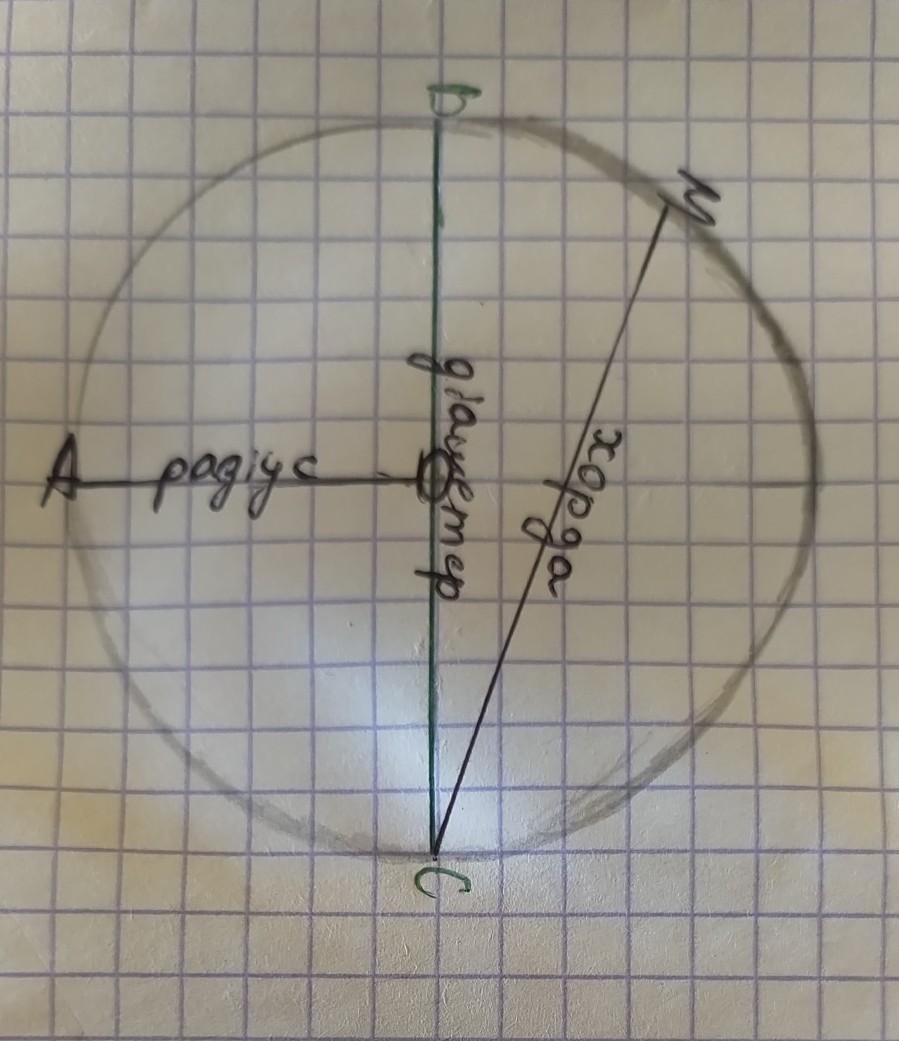 Побудувати коло, радіусом 3 см. Провести в ньому радіус ОА, діаметр ВС, хорду СМ.