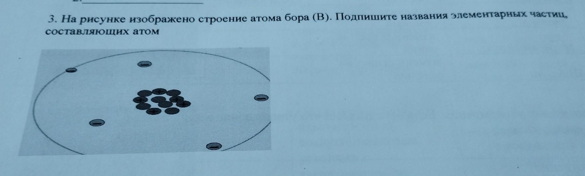 3. На рисунке изображено строение атома бора (в). Подпишите названия элементарных частиц, составляющих атом
