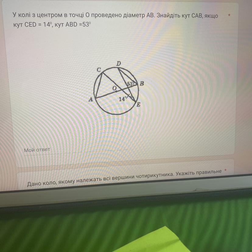розв: дуга АВ=180°, так як АВ діаметр. дуга СД=14*2=28° (так як кут СЕД вписаний і спирається на цю дугу). дуга АД=53*2=106°. дуга ДВ=180-106=74°. дуга СВ=28+74=102°. тоді кут САВ=102:2=51° (так як він вписаний і спирається на дугу 102°)