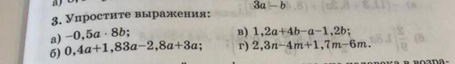упроститите выражение: a) -0,5a*8b; б) 0,4a+1,83a-2,8a+3a; B) 1,2a+4b-a-1,2b; Г) 2,3n-4m+1,7m-6m.