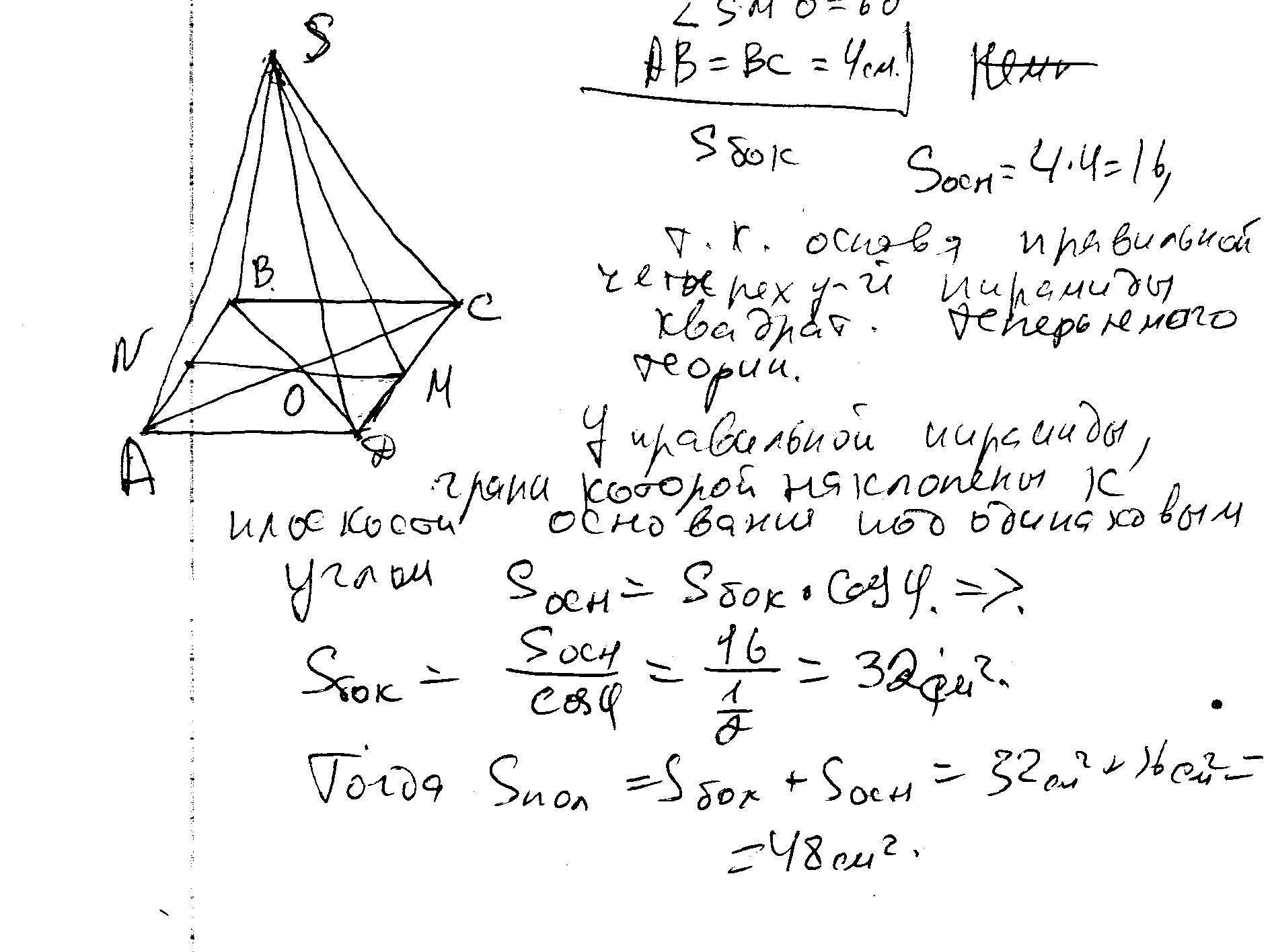 В правильній чотирикутній піраміді відстань від центра основи до бічної грані 12 см. Бічна грань утворює з основою кут, рівний 30°. Знайти сторону основи