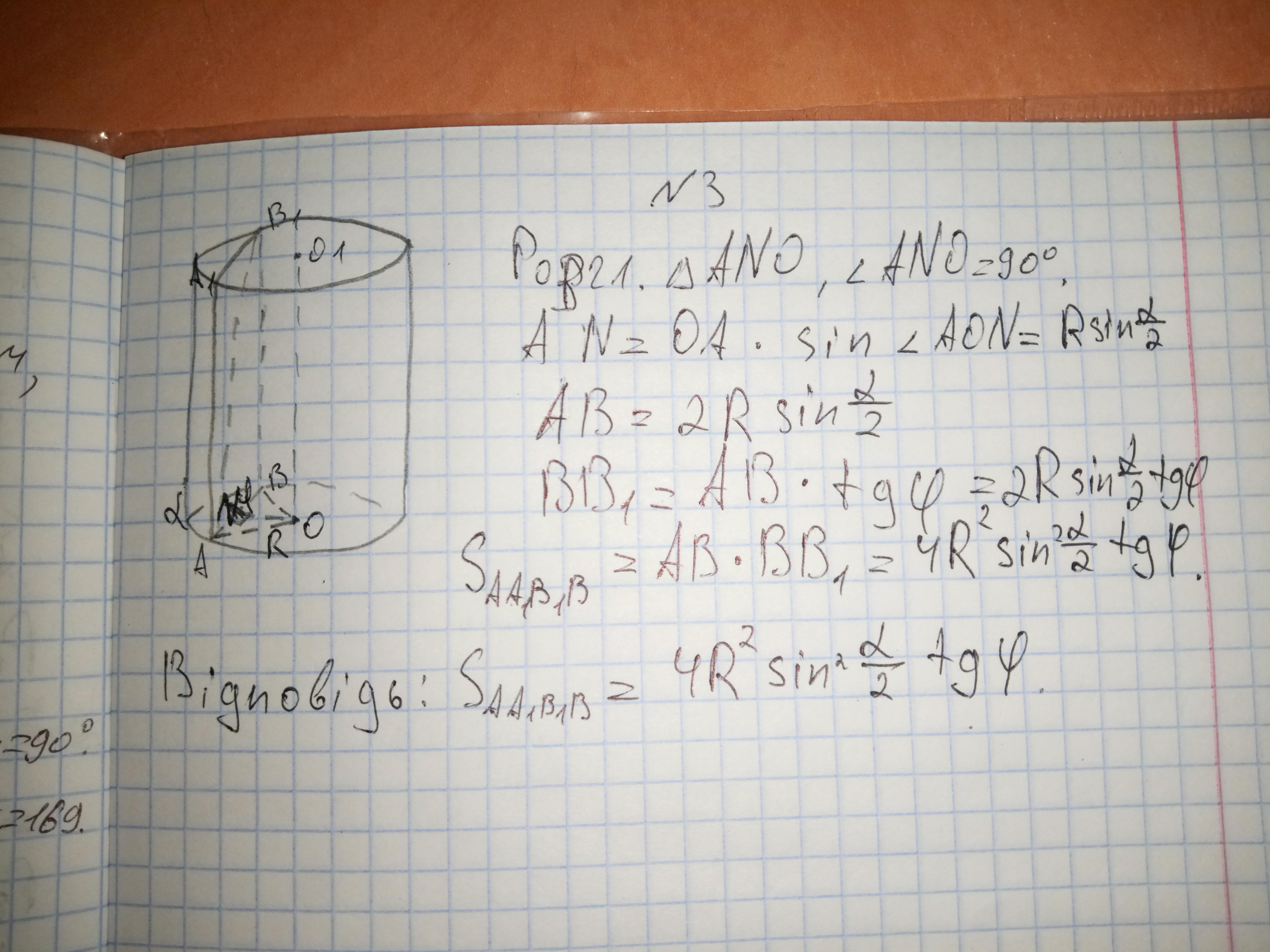 Объяснение: находим синус AON, который равен половине дуги альфа, далее через синус и гипотенузу треугольника ANO находим AN, AB = 2AN, ну а BB1 находим по тангенсу фи и стороне АВ, которую мы уже нашли. АВВ1А1 — прямоугольник, формулу нахождения площади прямоугольника все мы учили ещё во втором классе, так что с этим вопросов быть не должно.
