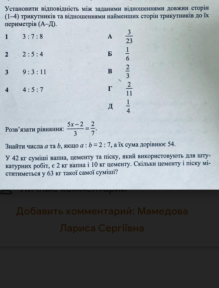 3. Установити відповідність між заданими відношеннями довжин сторiн (1-4) трикутників та відношеннями найменших сторін трикутників до їх периметрів (А-Д). 1 3:7:8 2 3 2:5:4 9:3:11 4 4:5:7 A Б B r Д ml rio dim N/= =it 3 23 1 6 2 3 2 11 1 4