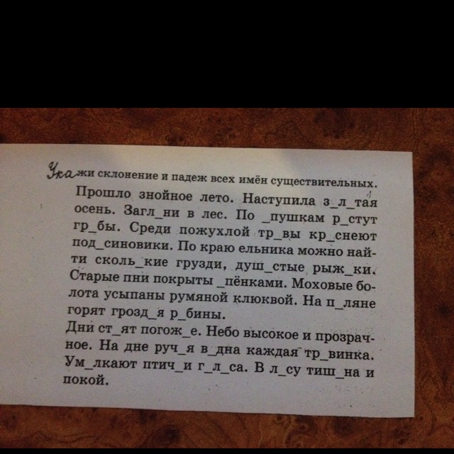 лето(1скл., им.п), осень(3 скл., им.п), в лес(2 скл., вин.п), по опушкам(1 скл., род.п), грибы(2 скл., вин.п), травы(1 скл., род.п), подосиновики(2скл., им.п), по краю(2 скл., д.п), ельника(2скл., род.п), грузди(2 скл., вин.п), рыжики(2скл., вин.п), пни(2 скл., им.п), опёнками(2скл., твор.п), болота(2 скл., им.п), клюквой(1скл., твор.п), на поляне(1скл., пред.п), гроздья(2скл., им.п), рябины(1скл., род.п), дни(2скл., им.п), небо(2скл., им.п), на дне(2скл., пред.п), ручья(2скл., род.п), травинка(1скл., им.п), голоса(2скл., им.п), в лесу(2скл., пред.п.), тишина(1скл., им.п), покой(2скл., им.п).