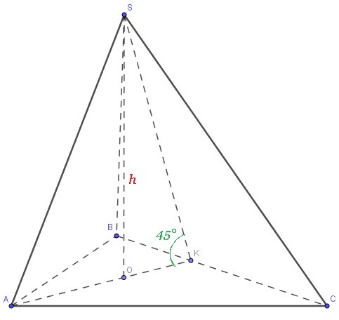 ДАНО: SАВС - правильная треугольная пирамида ; SD = h ; линейный угол двугранного угла ABCS равен 45°.