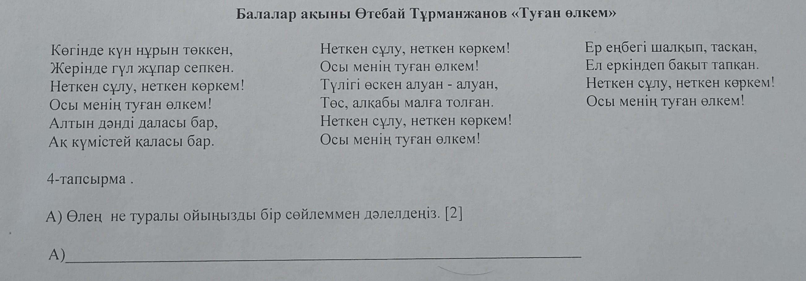 Өлеңнен мен өзіміздің туған жерімізге жететін жер жоқ екенін жәнеде осы тұрып жатқан жеріміздің қандай әдемі, көркем екенін түсіндім.
