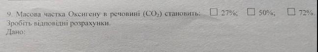 9. Масова частка Оксигену в речовині (CO)) становить: Зробіть вiдповiднi розрахунки. Дано: 27%; 50%; 72%. СРОЧНО