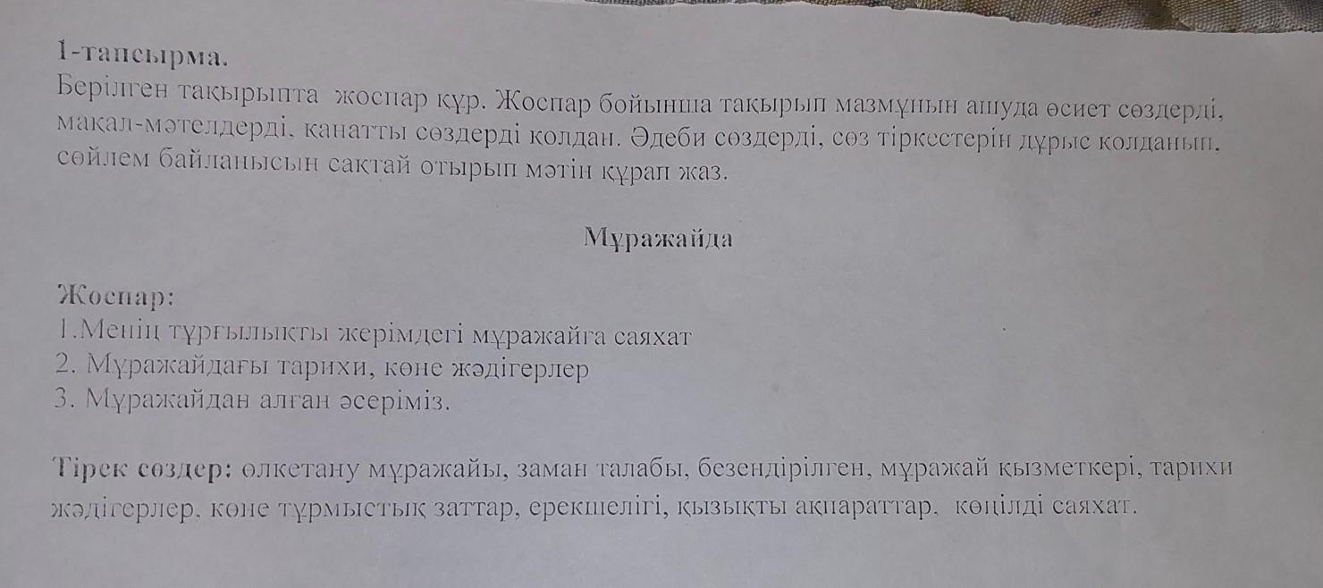 1-тапсырма. Берілген такырыпта жоспар құр. Жоспар бойынша тақырып мазмұнын ашуда осиет сездерді, макал-мәтелдерді, канатты сөздерді колдан. Әдеби сөздерді, сөз тіркестерін дұрыс колданып, сойлем байланысын сақтай отырып мәтін құрап жаз.