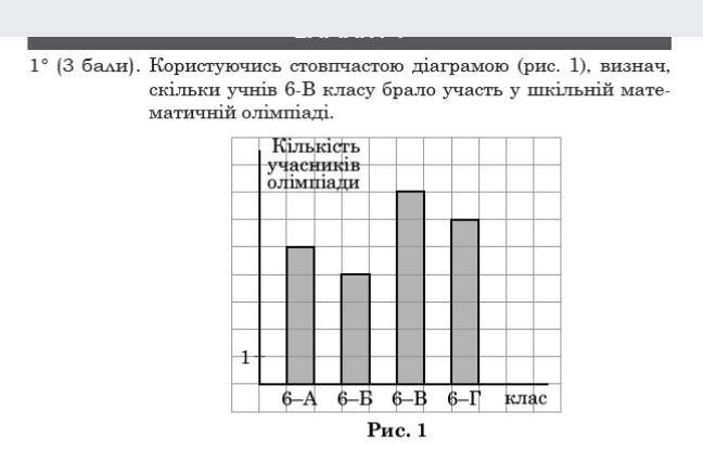 Користуючись стовпчастою діаграмою визнач, скільки учнів 6-В класу брало участь у шкiльнiй мате- матичній олімпіаді. H Кількість учасників олімпіади 6-А 6-Б 6-В 6-Г клас