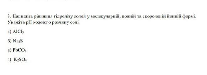 3. Напишіть рівняння гідролізу солей у молекулярній, повній та скороченій йонній формі. Укажіть рН кожного розчину солі. a) AICI3 6) Na2S B) PbCO3 г) K2SO4