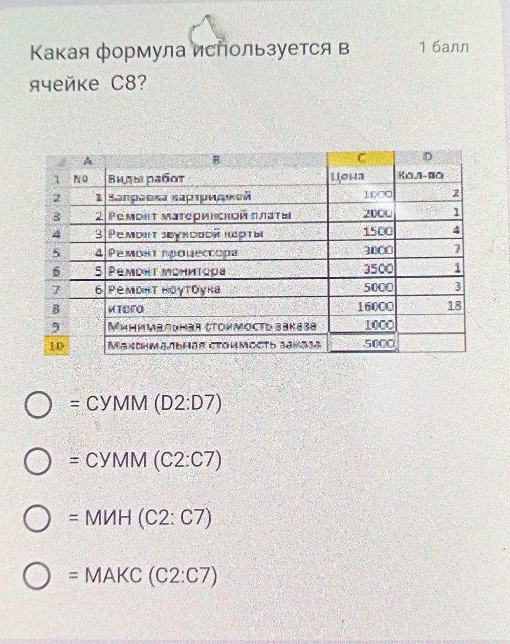 СУММ - сумма значений в клеточках с C2 по C7 (C2:C7)