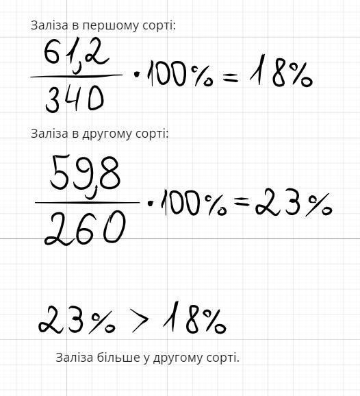 Видомо що 340 кг руди одного сорту мистять 61,2 кг зализа а 260 кг руди иншого сорту 59,8 кг зализа. В який руди , перший чи другий,вищий видцотковый вмист зализа