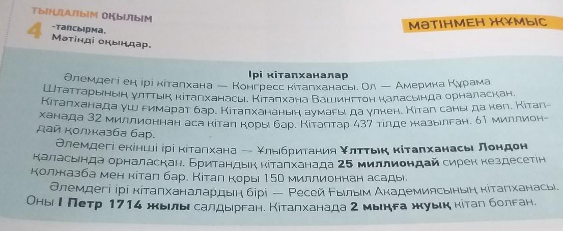 ТЫҢДАЛЫм окылым -тапсырма Матiндi окындар. 4 M Iрi кiтапханалар Америка Құрама Әлемдегі ең iрi кiтапхана - Конгресс кітапханасы. Ол - Штаттарының ұлттық кітапханасы кітапхана Вашингтон каласында орналаскан. Кітапханада үш гимарат бар. Кітапхананың аумағы да улкен. Кітап саны да көп. Кітап- ханада 32 миллионнан аса кітап коры бар. Кiтаптар 437 тiлде жазылған. 61 миллион- дай колжазба бар. Әлемдегі екiншi iрi кiтапхана Ұлыбритания Ұлттық кітапханасы Лондон каласында орналаскан. Британдық кітапханада 25 миллиондай сирек кездесетін колжазба мен кітап бар. Кітап коры 150 миллионнан асады. Әлемдегi iрi кiтапханалардың бірі - Ресей Ғылым Академиясының кітапханасы Оны I Петр 1714 жылы салдырған. Кітапханада 2 мыңға жуық кітап болған. выписать глаголы пж