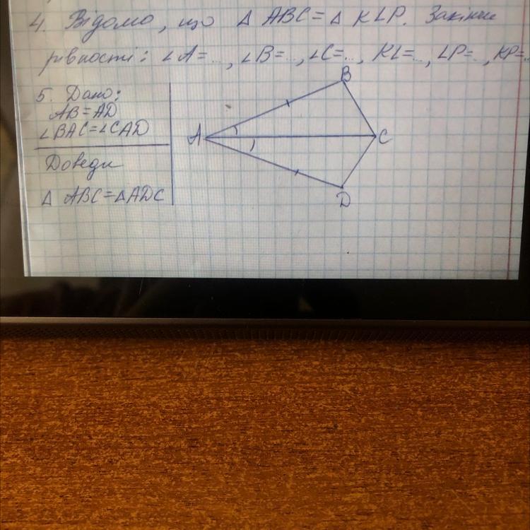 5) Два трикутники рівні за 1 ознакою рівності трикутників, тобто 2 сторони і кут між ними (сторона АС спільна для двох трикутників)