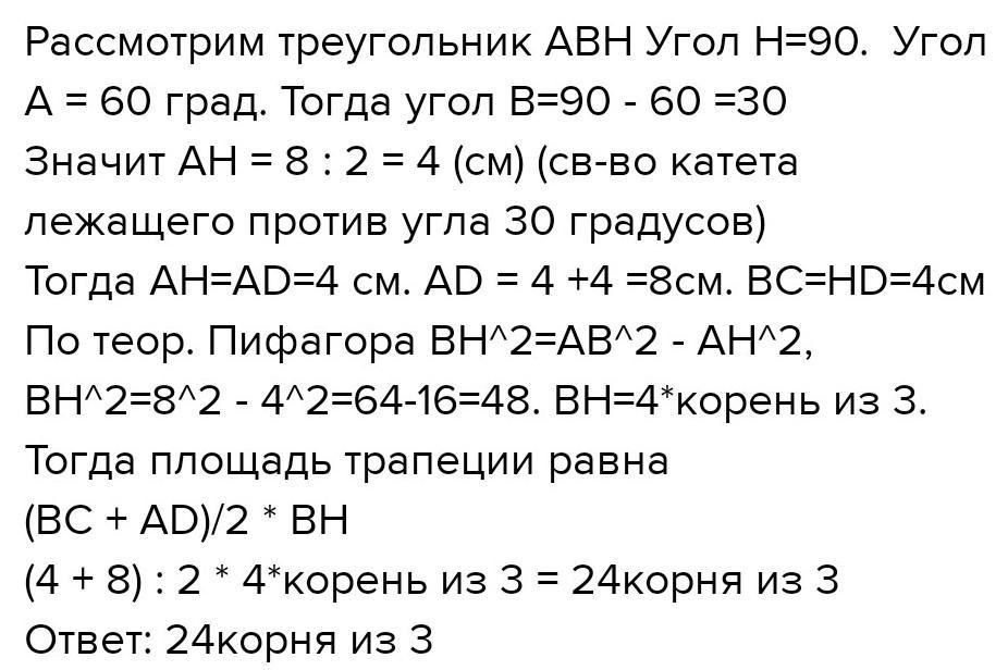 В прямоугольной трапеции ABCD большая боковая сторона равна 10 см, угол D равен 60град, а высота CH делит основание AD пополам. Найдите площадь трапециий