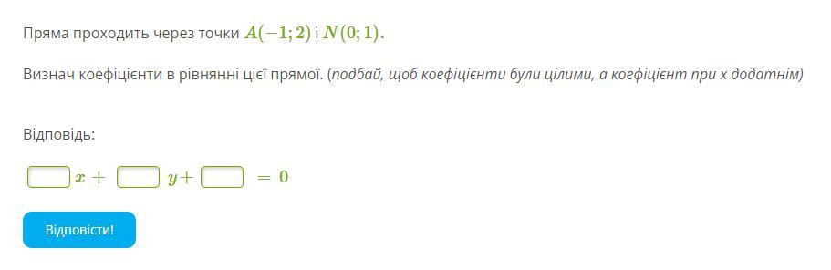 Визнач коефіцієнти в рівнянні цієї прямої. (подбай, щоб коефіцієнти були цілими, а коефіцієнт при х додатнім)