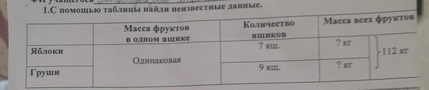 1.С помощью таблицы найди неизвестные данные. Масса фруктов в одном ящике Яблоки Груши Одинаковая Количество ящиков 7 ящ. 9 ящ. Масса всех фруктов ? кг ? кг 112 кг