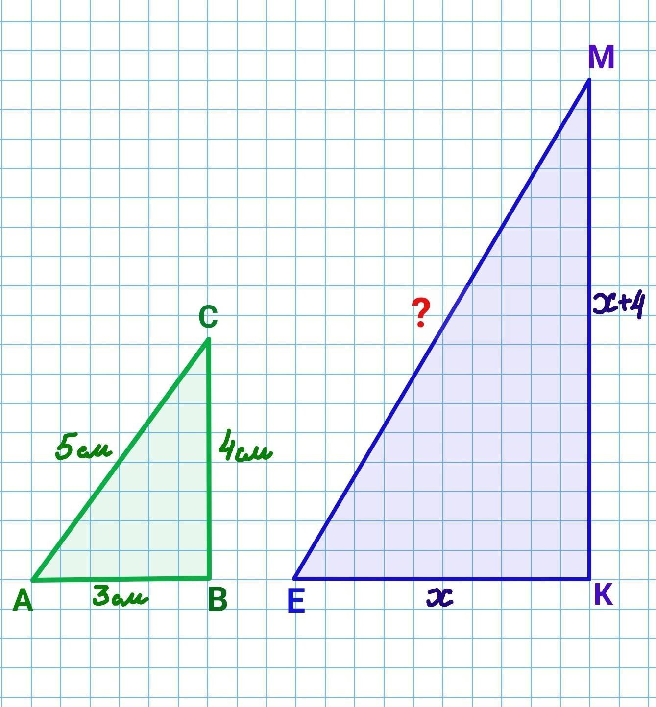 Трикутники ABC і EKM подібні. AB = 3 см, ВС = 4 см, АС = 5 см. Сторони КМ на 4 см більша, ніж ЕК. Знайти довжину найбільшої сторони трикутника ЕКМ.