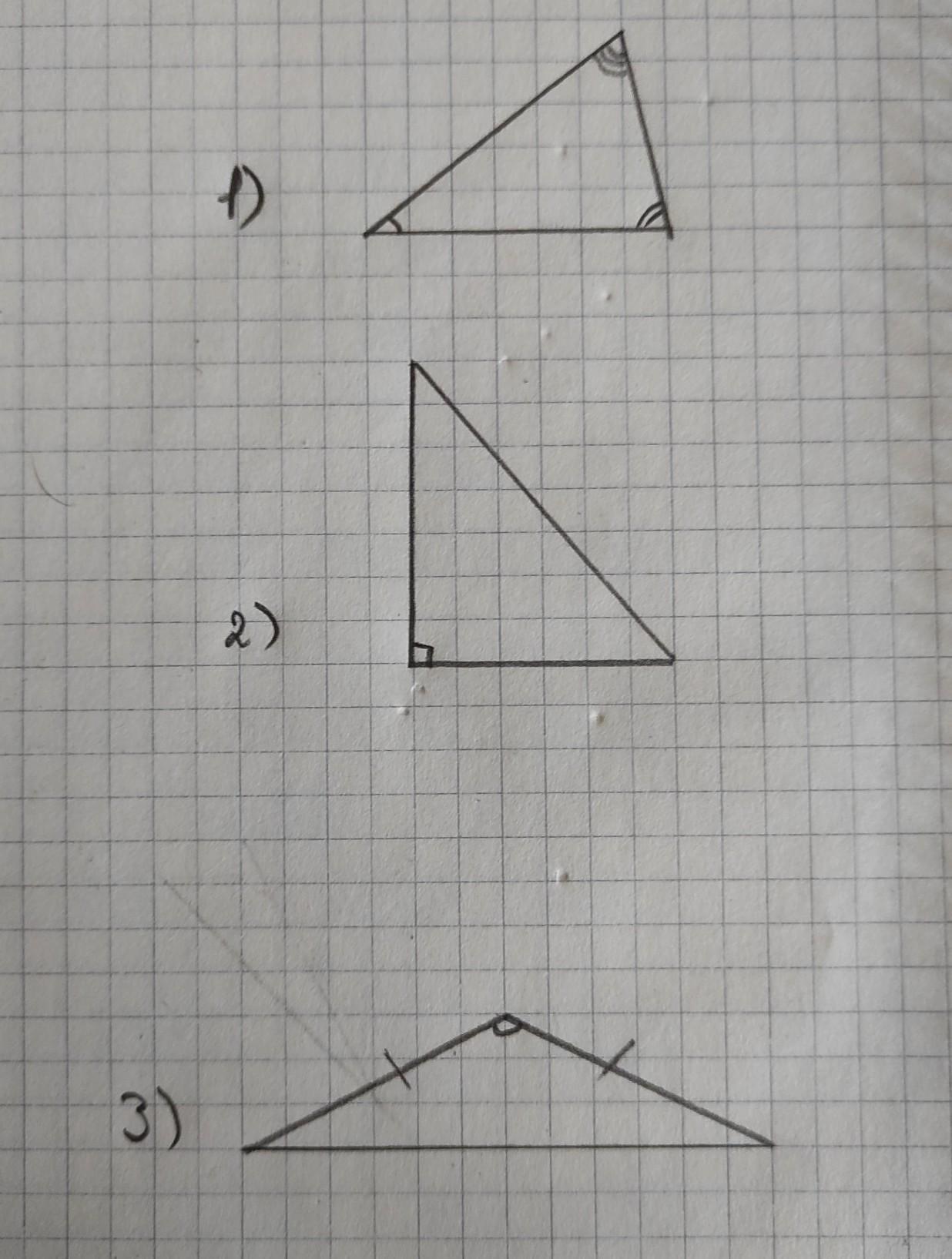 Накресліть: 1) рiзносторонній гострокутний трикутник; 2) рiзносторонній прямокутний трикутник; 3) рівнобедрений тупокутний трикутник.