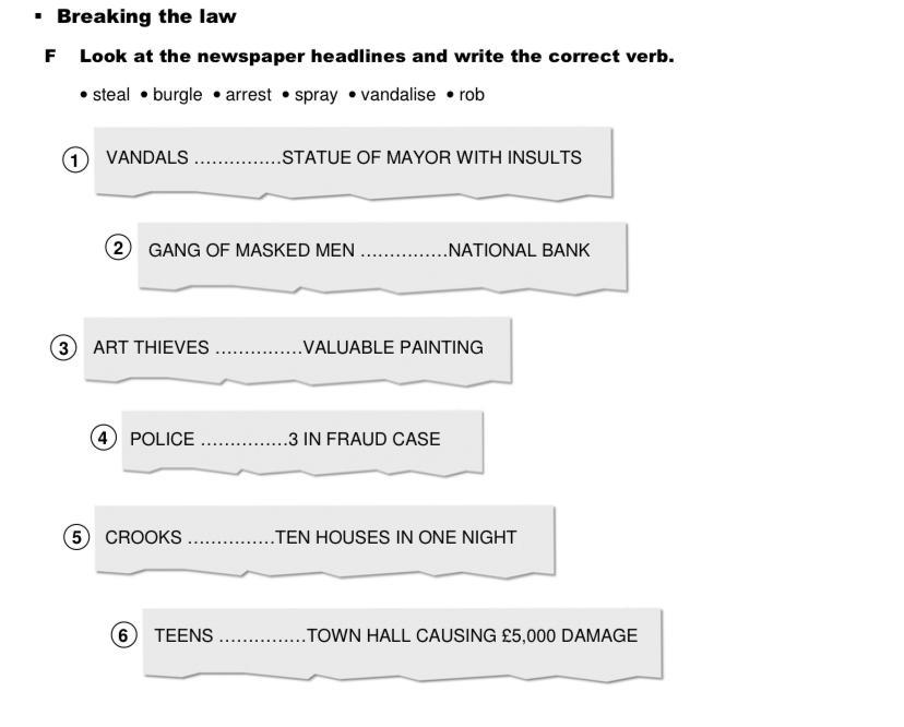 1 VANDALS................STATUE OF MAYOR WITH INSULTS 2 GANG OF MASKED MEN ...............NATIONAL BANK 3 ART THIEVES VALUABLE PAINTING 4 POLICE................3 IN FRAUD CASE 5 CROOKS..........TEN HOUSES IN ONE NIGHT 6 TEENS.............. TOWN HALL CAUSING £5,000 DAMAG