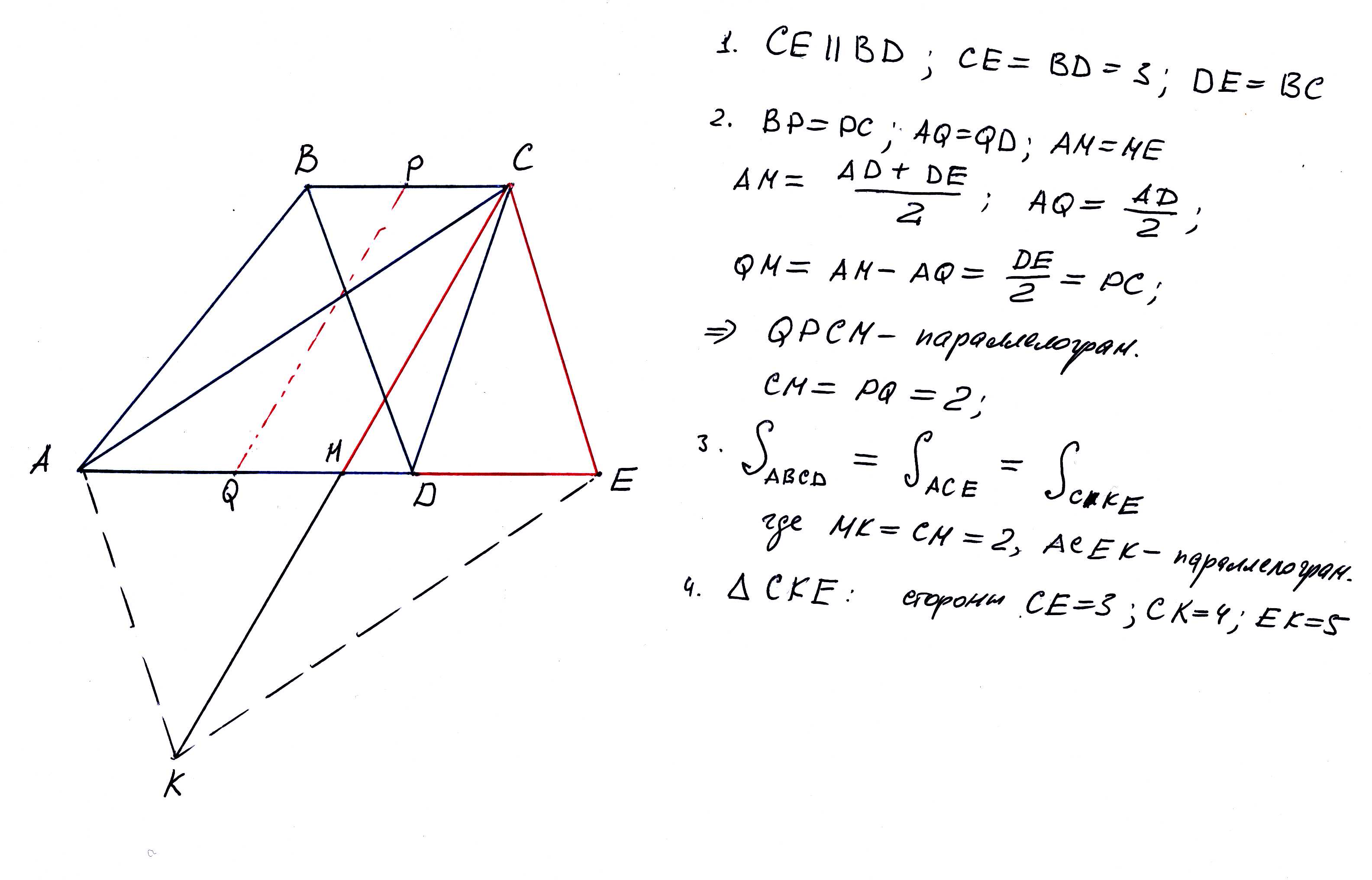 Его площадь 3*4/2 = 6 равна площади трапеции.