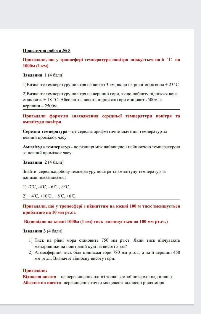 мандрівники на повітряній кулі на висоті 5 км? 2) Атмосферний тиск біля підніжжя гори 780 мм рт.ст., а на її вершині 450 мм рт.ст. Визначте відносну висоту гори.