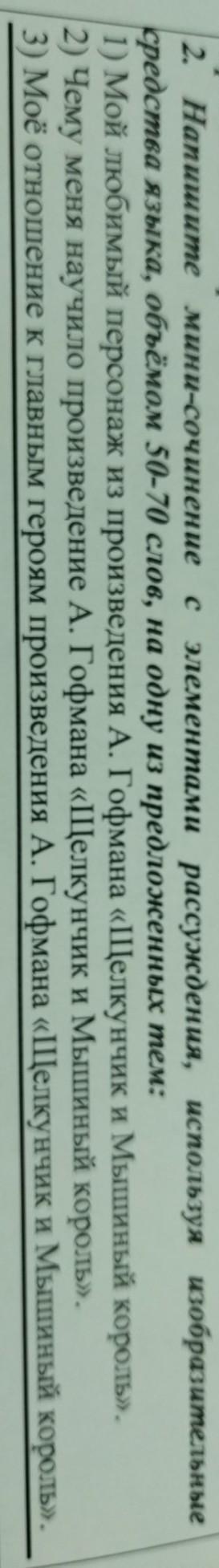 2. Напишите мини-сочинение с элементами рассуждения, используя изобразительные средства языка, объёмом 50-70 слов, на одну из предложенных тем: 1) Мой любимый персонаж из произведения А. Гофмана «Щелкунчик и Мышиный король». 2) Чему меня научило произведение А. Гофмана «Щелкунчик и Мышиный король». 3) Моё отношение к главным героям произведения А. Гофмана «Щелкунчик и Мышиный король». помогите пж пж пж