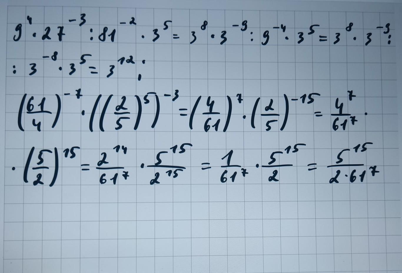 СРОЧНО!!!!!!!! даю 40 балов. Знайдіть значення виразу 9^4×27^-3/81^-2×3^5; (61/4)^-7×((2/5)^5)^-3